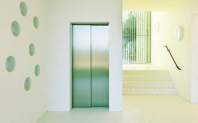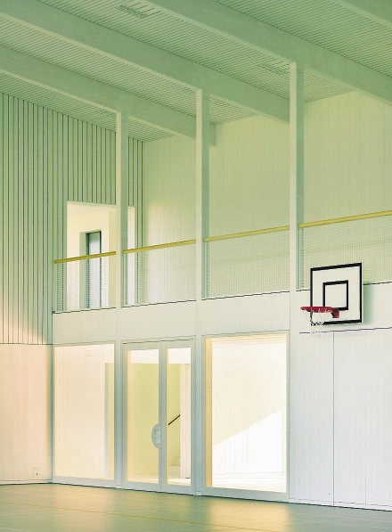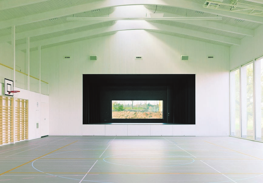 Die neue Mehrzweckhalle ist gegen Norden hin verglast und öffnet den Blick in die Landschaft. Über eine grosse Schiebewand lässt sich die Bühne zur Halle hin öffnen. Im oberen Geschoss der Mehrzweckhalle befinden sich die Garderoben, die Toiletten sowie die Haustechnik.