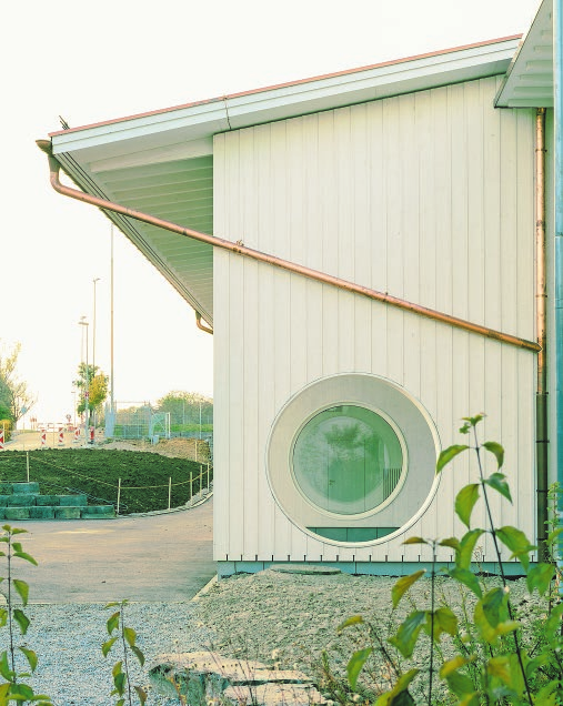 Sie wurde am bestehenden Standort neu gebaut und über ein neues Treppenhaus mit dem bestehenden Schulhaus schwellenlos verbunden. Der Neubau ist kompakt und einfach organisiert. Zur Schulhausstrasse hin ist das Dach südseitig weit nach unten gezogen, wodurch der Bau zusammen mit dem Schulhaus ein stimmiges Ensemble bildet. Ein gedeckter Aussenbereich sowie das Foyer bilden den neuen gemeinsamen Eingang zu Mehrzweckhalle und Schule.